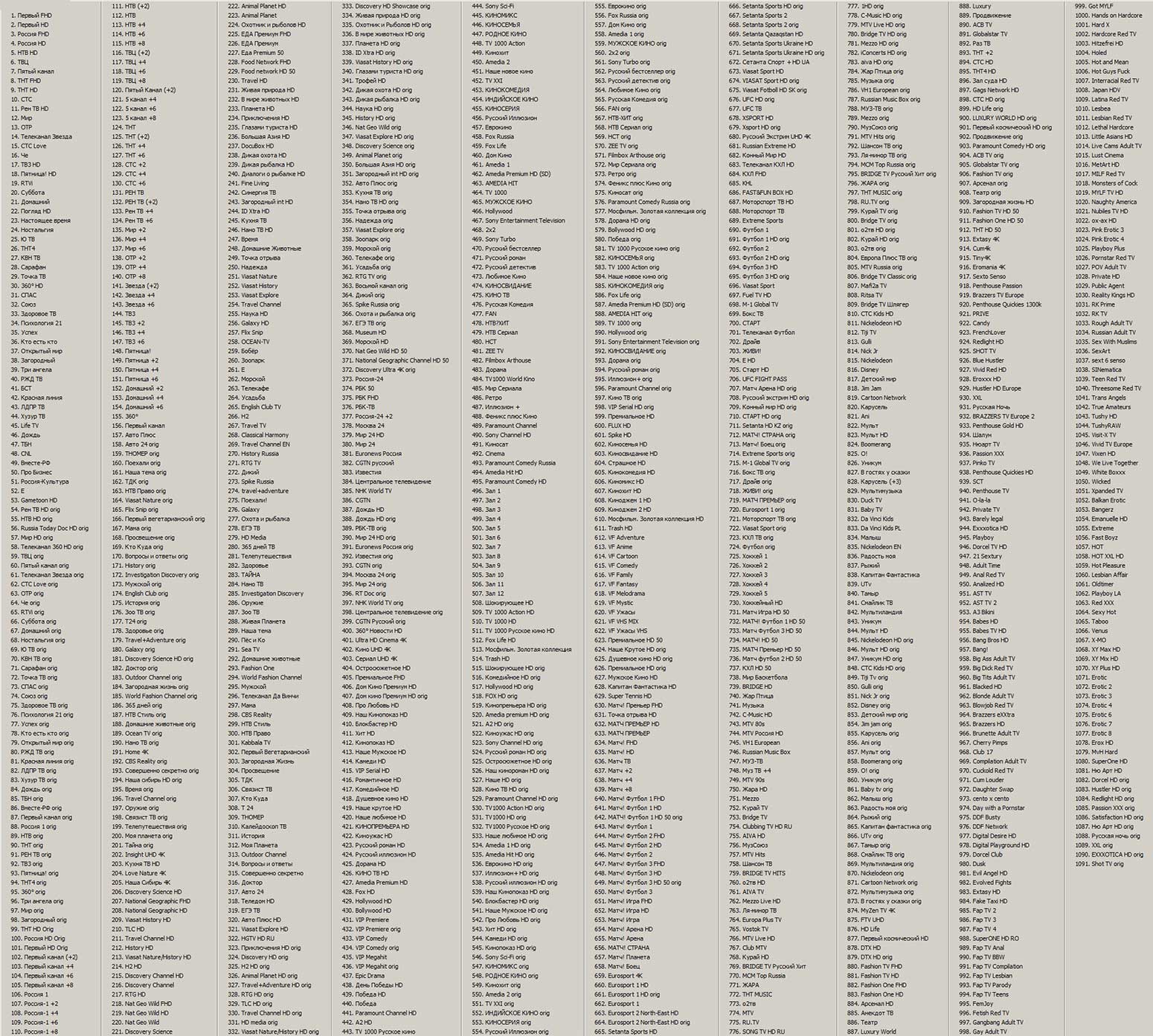 Все Вам известные и неизвестные (всего более 3.000). Из них русскоязычных центральных более 150 каналов, спортивных более 120, каналов кино более 500, детских более 100, для взрослых около 300 и т.д. Список постоянно расширяется. Естественно, что Первый, Россия, НТВ, ТНТ, МИР, МИР 24, Россия 24, полный пакет российских МАТЧ-каналов, полный пакет каналов Discovery на русском… и т.д., и т.п. входят в пакет. Огромное количество региональных, национальных каналов (Австралия, Арабские, Армения, Азербайджан, Беларусь, Болгария, Бразилия, Великобритания, Германия (около 150-ти каналов), Грузия, Дания, Египет, Израиль, Индия, Испания, Казахстан, Канада, Латвия, Литва, Молдавия, Нидерланды, Норвегия, ОАЭ, Польша, Португалия, Румыния, Словакия, США, Таджикистан, Турция, Узбекистан, Украина (около 170 каналов), Финляндия, Франция, Чехия …)